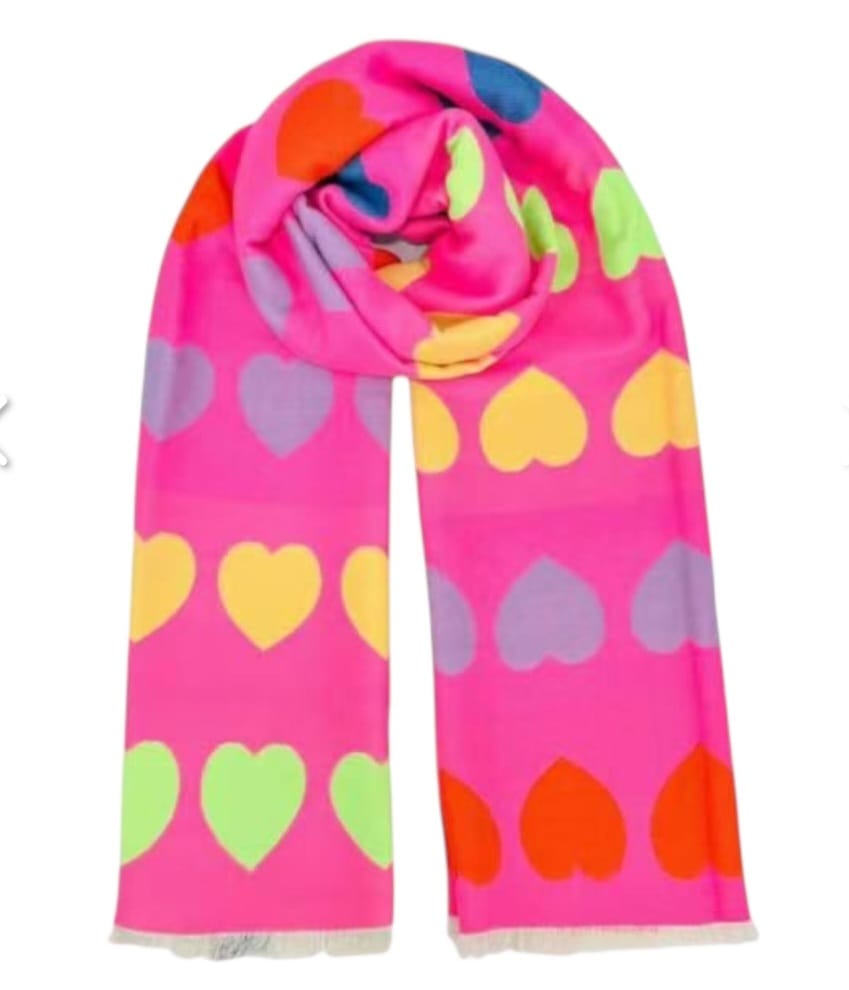 Deze vrolijke shawl met kleurrijk hartjespatroon geeft elke outfit een speelse touch en houdt je heerlijk warm.